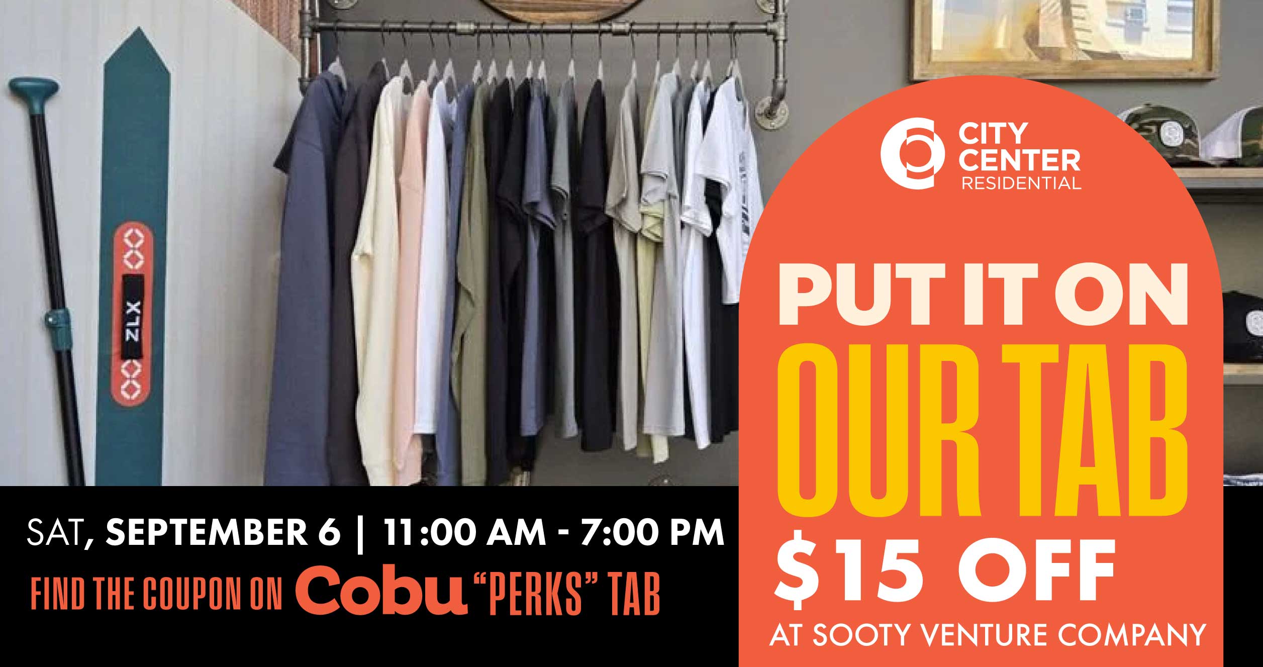 The first 50 residents to redeem their Cobu coupon will get $15 OFF off their entire purchase at Sooty Venture Company located under Cityplace Apartments on Hamilton St.
