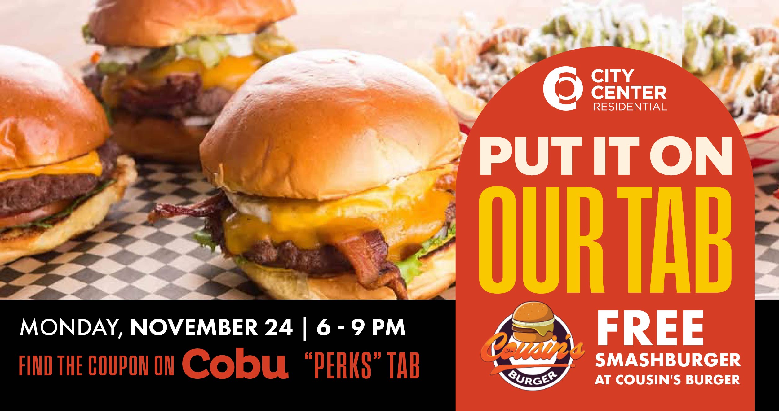 The first 50 residents to show their Cobu coupon will receive a free single smashburger at Cousin’s Burger on Monday, November 24, from 6-9 p.m.
